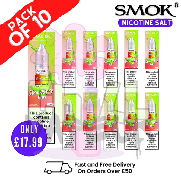 Strawberry Kiwi Smok Nic Salt E Liquid BOX OF 10 delivers a perfect fusion of sweet, ripe strawberries and tangy tropical kiwi. This fruity pairing offers a smooth and refreshing vape that is both vibrant and satisfying, making it an ideal choice for fruit lovers.