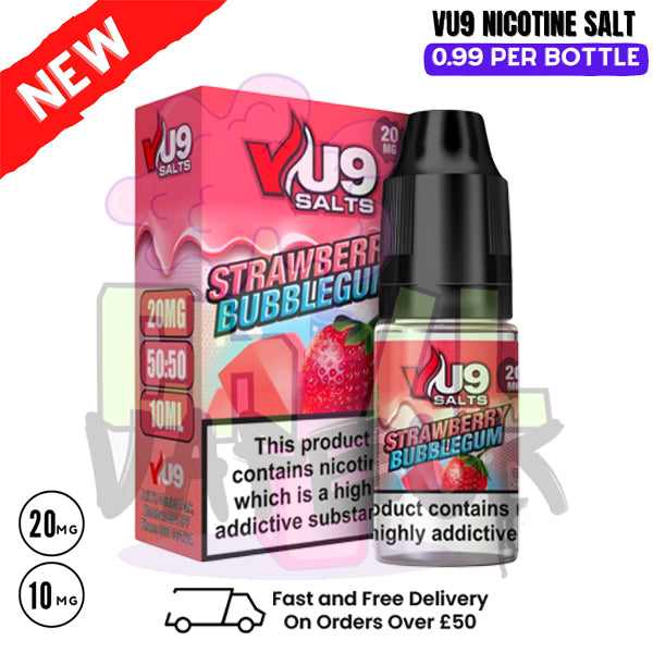 Strawberry Bubblegum Nic Salt by VU9 delivers a nostalgic and irresistible vaping experience that blends the sweet juiciness of ripe strawberries with the chewy, sugary essence of classic bubblegum. Each puff bursts with fruity freshness on the inhale, followed by a playful candy-like sweetness on the exhale, making it a perfect all-day vape for flavor lovers. Crafted with high-quality nicotine salts, this e-liquid offers a smooth and satisfying throat hit, even at higher nicotine strengths. It’s specifically designed for mouth-to-lung (MTL) vaping in pod kits and low-wattage devices, ensuring consistent flavor delivery and optimal satisfaction at an affordable price of just 99p.