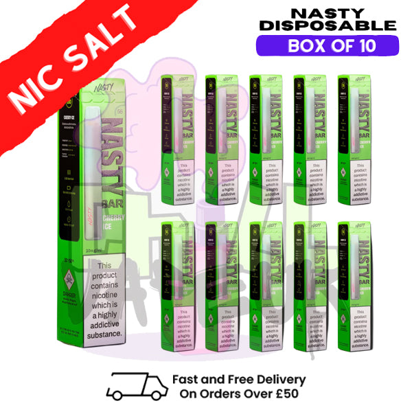 Experience a bold and icy vape with Cherry Ice Nasty Bar DX2 Disposable Box Of 10. This disposable device combines the sweet, juicy taste of ripe cherries with a crisp icy finish, delivering a smooth and satisfying nicotine hit ideal for vapers who enjoy fruity and refreshing flavours without the hassle of refilling or charging.