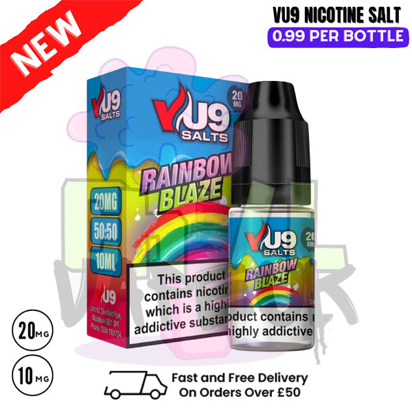 The Rainbow Blaze Nic Salt 10ml by VU9 delivers a vibrant, multi-fruit explosion of flavour, combining sweet, tangy, and refreshing notes in every puff. Formulated with nicotine salts, it provides rapid nicotine absorption and a smooth, satisfying throat hit, perfect for pod devices.