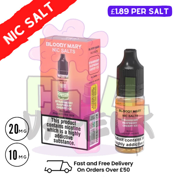 Strawberry Raspberry Cherry ICE Bloody Mary 10ML Nic Salt. This premium nic salt e-liquid delivers a smooth, satisfying hit that balances fruity sweetness with a refreshing icy coolness, perfect for fans of crisp and invigorating flavours.