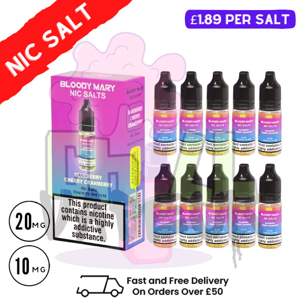 Blueberry Cherry Cranberry by Bloody Mary is a bold and fruity nic salt e-liquid, blending the sweetness of blueberries, the tartness of cherries, and the tangy kick of cranberries for a multi-layered flavour experience. This Box of 10 pods provides a convenient supply for uninterrupted vaping, ideal for vapers who love a complex berry medley.