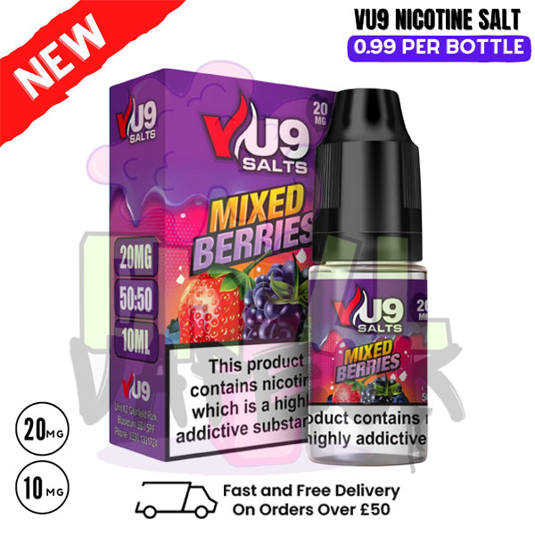 The Mixed Berries Nic Salt 10ml by VU9 delivers a delightful blend of juicy strawberries, raspberries, and blueberries for a sweet and tangy vaping experience. Formulated with smooth nicotine salts, it provides a fast nicotine hit with consistent flavour, ideal for pod devices.