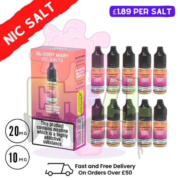 Strawberry Raspberry Cherry ICE by Bloody Mary is a fruity and refreshing nic salt e-liquid, combining the sweetness of strawberries, raspberries, and cherries with a cool icy finish. This Box of 10 pods ensures a convenient supply for uninterrupted vaping, making it perfect for vapers who love a mixed berry and cherry icy flavour.